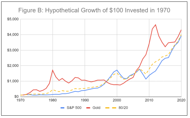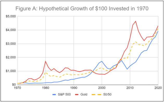 This can be seen visually in the growth of $100 invested in 1970 in each of the asset classes compared alongside a portfolio of 50% gold and 50% stocks: