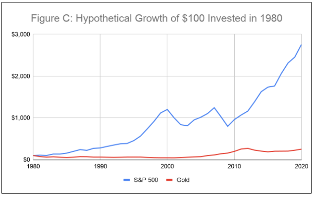 In the 50 years ended January 2020, the price of an ounce of gold in nominal dollar terms has grown at a 7.7% compound annual rate whereas the S&P 500 index has grown at a 7.6% annual rate over the same time period.